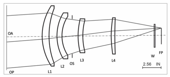 Four-element refractive system, FER. The optical axis, OA, is perpendicular to all optical components. The optical stop, OS, is located between lens L2 and L3. Other annotations: OP—object plane; L1—lens 1; L4—lens 4; W—window; and FP—focal plane.