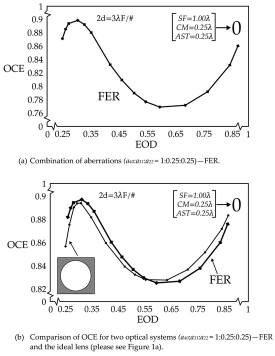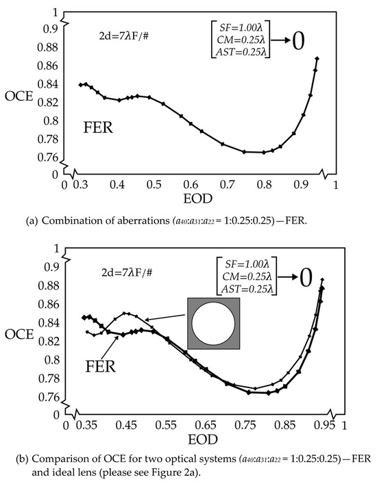 We may also note that the OCE vs. EOD graph for a FER sensor with a mixture of aberrations (a40:a31:a22 = 1:0.25:0.25) for a detector pixel size 2d = 3λF/# is very similar to the case of only spherical aberration, a40 = 1.25 λ, included in Figure 1b (Figure 1, Ref. [7]).