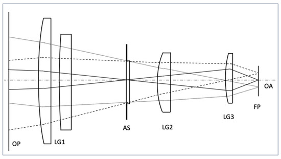 Modified Cooke triplet, after US Patent 10,007,098 [10]. Other annotations: OP—object plane; LG1—lens group 1; LG2—lens group 2; LG3—lens group 3; AS—aperture stop; FP—focal plane; and OA—optical axis. The original figure from the patent, illustrating the full details, is reproduced in Appendix B.