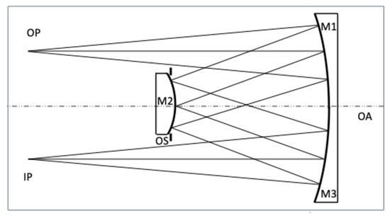 The same conclusion may be drawn about the Offner relay system [11], displayed in Figure 13. This is a one-to-one, finite conjugate, symmetric layout with respect to the optical stop at the secondary mirror. The system is concentric as follows: mirror M1 is integrated with mirror M3, and mirror M2 features literal top–bottom symmetry with respect to the optical axis.