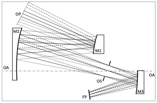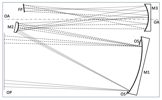 TMA optical layout indicating the salient features, after Ref. [14], EP Patent 019447. The optical stop, OS, is located at the first mirror, M1. The optical axis, OA, is perpendicular to mirror M3. Other annotations: OP—object plane; M2—mirror 2; and FP—focal plane. The original image from the patent, illustrating the full details, is reproduced in Appendix B.
