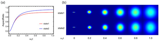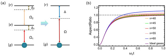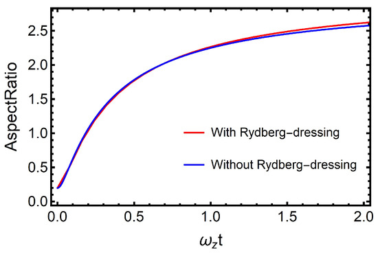 We study the expansion dynamics by numerically solving the dynamic Equation (6) for Rydberg-dressed atoms with different quantum numbers (), taking the initial boundary conditions for the atoms as , . The results can be seen in Figure 1b, where the atoms are released from the anisotropic harmonic trap, with the initial aspect ratio set to 0.2. We change the interaction by exciting the cloud to different Rydberg states with the same detuning and Rabi frequency. The aspect ratio of the cloud is defined as by taking the initial condition as a thermal equilibrium state.