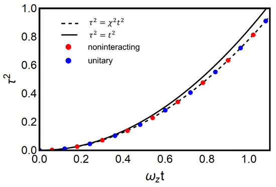 However, the breaking of scale invariance symmetry was found in the Rydberg-dressed Fermi gas, as shown in Figure 4. The emergence of a new length scale due to the Rydberg dressing breaks the symmetry by slowing down the overall expansion dynamics. After fitting the data for the Rydberg-dressed Fermi gas, we found scalings for both the non-interacting and unitary Fermi gases. The expansion dynamics fell on the same curve, with being about 0.91, which means that non-local Rydberg interactions break the symmetry at a longer spatial scale with hardly any connections to the short-range scattering interaction. This potentially offers a new method for manipulating many-body dynamics with a high controllable interaction strength and diverse spatial dimensions.