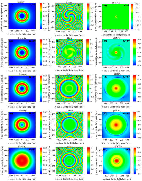 Figure 1(d1–d3) show the intensity and the phase, and amplitude distributions with G = 0.4, respectively. As in Figure 1(a1–c1), the intensity at the center point continues to increase, and the diameter of the dark hollow region continues to decrease. The coherence vortex for the phase of the degree of coherence and the vortex structure for the amplitude of the degree of coherence disappear. When G = 0.4, the partially coherent vortex beam has no coherence singularity or coherence vortex in the distribution of the phase or the amplitude of the degree of coherence relative to the central point at the far-field plane.