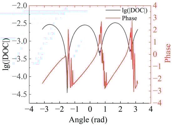 From Figure 1(b2,b3), one can extract the phase and amplitude of the degree of coherence relative to the central point along the radial direction with a radius of 297.6 μm, where the degree of coherence vanishes. The phase and amplitude distributions of the degree of coherence relative to the central point as a function of the azimuthal angle are shown in Figure 2. The phase and the amplitude of the degree of coherence have apparent periodic distributions, and the phase uncertainty point corresponds to a degree of coherence of 0. The azimuthal angles for the phase uncertainty points are −1.5 rad, 0.65 rad, and 2.76 rad, where the coherence vortex and coherence singularities can be located. For partially coherent light, the phase uncertainty points, and coherence singularities coincide with each other.