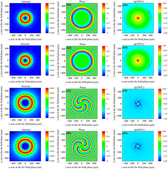 (a1–d1) Intensity distributions, (a2–d2) phase distributions of the degree of coherence relative to the central point, and (a3–d3) lg(|DOC|) relative to the central point distributions in the far-field plane with different topological charges. The topological charges from the 1st to the 4th rows are 2, −2, 4, and −4, respectively.