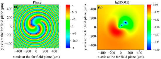 Under the condition of l = 3 and G = 0.4, (a) the phase distribution of the degree of coherence relative to the point (−100 μm, −100 μm) at the far-field plane and (b) the amplitude distribution of the degree of coherence relative to the point (−100 μm, −100 μm) at the far-field plane. The three blue areas in Figure 4b indicate the three coherence singularities.