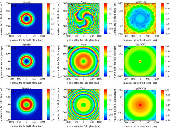 Figure 1(a1–a3) show the intensity and the phase and amplitude distributions of the degree of coherence relative to the central point at the far-field plane under fully coherent conditions, respectively. The diameter of the dark hollow is 174 μm. The topological charge l is 3, according to the observation of the vortex state of the phase. The phase [cf. Figure 1(a2)] distribution at the central point is uncertain, and phase singularity occurs at the central point. Therefore, the intensity [cf. Figure 1(a1)] at the central point is zero. An optical vortex occurs in a coherent field in the phase profile, and a dark hollow occurs in the intensity profile.