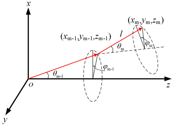 The collisions between photons and particles are illustrated in Figure 1. The mth collision scattering position of a particle is determined by its current scattering position , its current movement direction , and the photon’s random walk step length l. These relationships are expressed in Equation (5) [23],