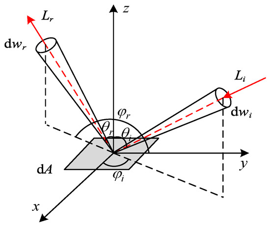 The reflection of pulsed laser light from a target’s surface in close-range detection includes both specular and diffuse reflection. The bidirectional reflectance distribution function (BRDF) describes the changes in radiance due to the reflective properties of the target surface material, and this theory is widely used to address scattering and radiation issues in microwave-, infrared-, and laser-based applications. Figure 2 shows the geometric relationship between the incident and reflection angles on a surface element dA, where and represent the zenith and azimuth angles of the incident light, and and represent the zenith and azimuth angles of the reflected light.