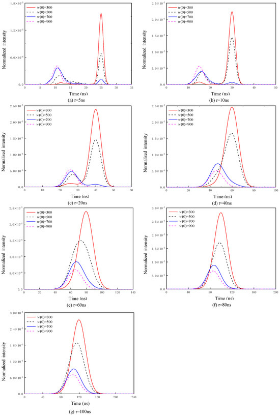 Figure 5b,c shows the backscattered smoke and target echo signals for pulse widths of = 10 and 20 ns, respectively, under various smoke concentrations w(0) in the laser detection system. The overall trends and results are consistent with those for = 5 ns. Specifically, when w(0) 700 , the echo signals include both the backscattered smoke signal and the target signal, which are temporally independent. The intensity of the backscattered smoke signal is positively correlated with the smoke concentration, whereas the intensity of the target signal is negatively correlated with the smoke concentration. At w(0) = 900 , the echo profile contains only the backscattered smoke signal, which is more intense than at other smoke concentrations.