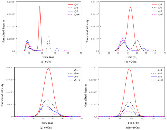 Figure 5d–g shows the backscattered smoke and target echo signals for pulse widths of = 40, 60, 80, and 100 ns, respectively, under different smoke concentrations w(0) in the laser detection system.