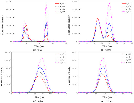 Figure 7a shows the target and smoke backscattered echo signals under different target reflectivity conditions with a laser pulse width of = 5 ns. In the time domain, the four echo curves for target reflectivities of = 0.2, 0.4, 0.6, and 0.8 contain two peaks with different amplitudes. The first peak represents the smoke particle backscattered echo, which is consistent within the time domain, and there is no clear relationship between the amplitude of this waveform and the target reflectivity. The second peak represents the target echo signal, and the target echo intensity is positively correlated with the target reflectivity. In general, the smoke backscattered echo amplitude Ps and the target echo amplitude Pt for target reflectivities of = 0.2, 0.4, 0.6, and 0.8 conform to the relationships Ps > Pt, Ps ≈ Pt, Ps < Pt, and Ps ≪ Pt, respectively. Thus, the target reflectivity has a significant effect on the target echo signal strength.