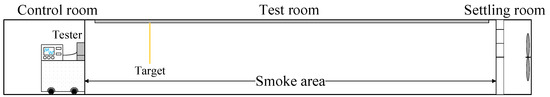 The desired smoke environment (primarily comprising NH4Cl) was created by igniting a certain dose of the NH4Cl smoke agent (adjustable as needed) in the test room. Th equipment control, observation, and recording of experimental phenomena were conducted from the control room. The test room was a long rectangular cuboid: length = 12 m, width = 2 m, and height = 2.5 m (Figure 9).