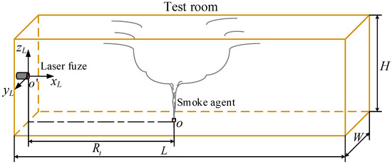 A Cartesian coordinate system, as shown in Figure 4, is established to describe the laser transmission process in a non-uniform smoke environment. In this system, both the laser emission and reception systems are placed on the same side, with their axes parallel to one another. For computational convenience, the center of the laser receiver’s detection surface is set as the origin of the coordinate system, where the line connecting the laser receiver system and the emission system serves as the x-axis, and the direction of the laser beam emission is along the z-axis.