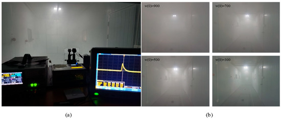 Figure 11 shows the experimental setup for evaluating the pulsed laser target echo characteristics in a smoky environment. Figure 11a presents the layout of the instruments and equipment in the control room, and Figure 11b presents the visual effects of the target under smoke concentrations of 900, 700, 500, and 300 mg/m3 in the laser detection system.