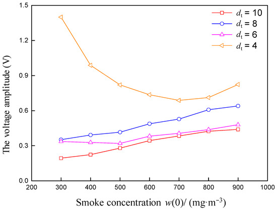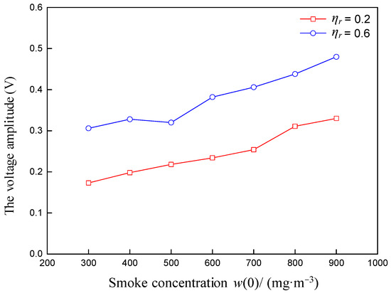 Figure 13 shows the changes in the target echo signal voltage amplitude as a function of the target reflector standard reflectivity . The target echo signal voltage amplitude changes almost in direct proportion to the smoke concentration. Under any given smoke concentration , the target echo signal voltage amplitude increases for a higher standard reflectivity of the target reflector. These experimental trends are consistent with the simulation-derived conclusions presented in Section 3.4.