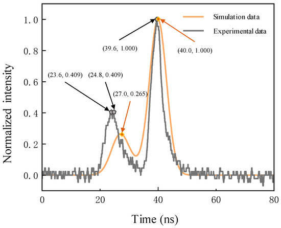 The experimental and simulation data for a target distance of = 6 m, a reflectivity of = 0.6, and a smoke concentration of w(0) = 500 were evaluated further. Due to the presence of amplification circuitry in the detection system, the actual waveform data were amplified in equal proportions. Therefore, these data were normalized based on their maximum amplitudes, thus ignoring their amplification [26]. The processed experimental and simulated waveforms are compared in Figure 14. The shapes of the two waveforms are almost identical: both signals contain two peaks corresponding to the smoke backscattered echo and the target echo. There are distinctions in both the time and energy domains in terms of the backscattered echo peak between the experimental and simulated waveforms, owing to the random variation of the smoke environment. However, the target echo peaks in the time domain were nearly identical, indicating that the developed simulation-based approach can be used to accurately determine the target distance under the range of tested conditions. Overall, these results further validate the effectiveness of the model proposed herein.