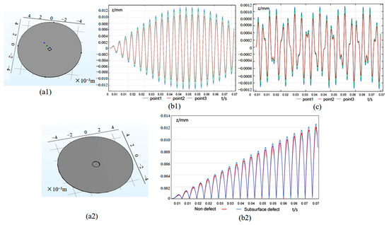 As shown in Figure 2(a1), a geometric model with a circular hole defect is constructed, where the depth of the hole defect was set to 1/100 of the thickness of the circular plate. A numerical solution was performed on this geometric structure, and three coordinate points were selected to calculate the difference of the displacement over time, as shown in Figure 2(b1). The closer to the defect area, the greater the vibration amplitude, which is consistent with theoretical analysis; thus, the amplitude at the defect can be used as an important indicator for defect identification. At resonance, the amplitude closely follows the excitation waveform; however, since the precise resonance frequency of the material is difficult to determine, an excitation frequency of 80 Hz is used. The displacement variation at non-resonant conditions in Figure 2c still shows significant amplitude differences between the defect and surrounding areas.