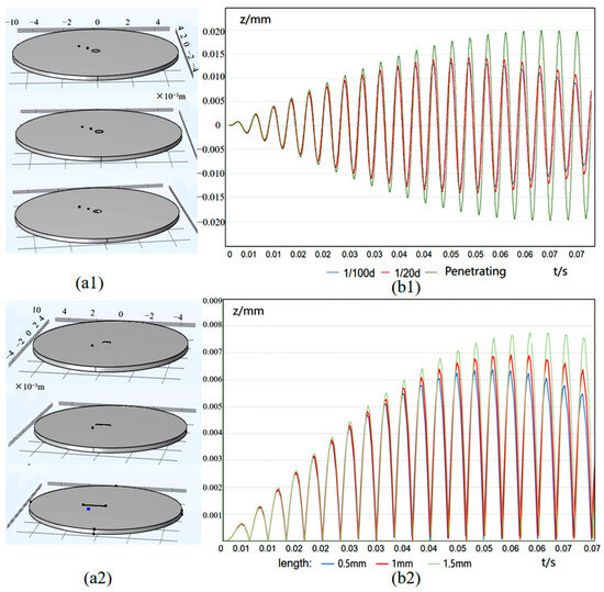 In order to study the influence of defect size on the surface vibration, circular hole defects of different depths are set in the model, which are d/100, d/20, and d, respectively, with d denoting the plate thickness, as shown in Figure 3(a1). A specific measurement point around the defect is set to analyze the numerical difference of the displacement field changing with time under different circular hole defect conditions, as shown in Figure 3(b1). In addition, crack defects of different lengths, namely 0.5 mm, 1 mm, and 1.5 mm, are set, as shown in Figure 3(a2). The same measurement point is selected to analyze the numerical difference of the displacement field changing with time under different crack defect conditions, as shown in Figure 3(b2).