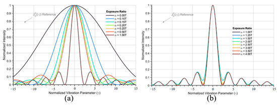 The amplitude envelopes associated with different exposure times are shown in Figure 4. It can be seen that the envelope gradually approaches as the exposure time gradually increases from a very short time to a time equal to the vibration period. When the exposure time is relatively shorter than the vibration period, the high-order Bessel function has a significant impact. When the exposure time is equal to the vibration period, the Bessel envelope is still valid. On the contrary, when the exposure time continues to increase, the distribution of light and dark rings in the reconstructed image is completely determined by .