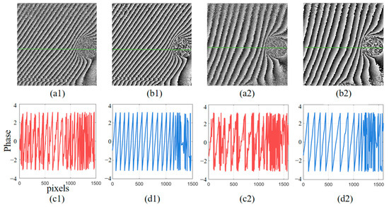 The sine-cosine transform method is applied to denoise the phase difference before and after vibration, and some of the results are shown in Figure 8. At the same time, some profiles are plotted to intuitively reveal the filtering effect. Among them, the green line is the manual drawing line, and Figure 8(c1,c2,d1,d2) illustrates the distribution of phase values along this line before and after filtering.