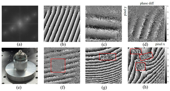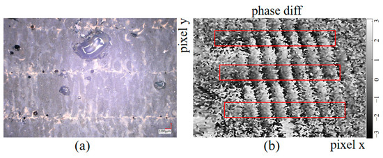 The off-axis angle is adjusted so that the object wave and reference wave can be separated in the spectrum domain, as shown in Figure 7c. Based on the double exposure method, two interference images before and after vibration deformation are recorded, and the deformation of the vibrating object is obtained by calculating the phase difference between the two interference images. After acoustic wave excitation, the surface of the object will produce deformation displacement, and the amplitude of the defect will be significantly different from the surrounding area. Therefore, defect identification can be achieved based on the abnormal areas of the phase differences.