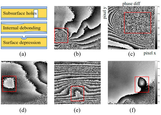 Defect identification of optical sandwich composite materials: (a) defects in sandwich adhesive materials, (b,c) phase difference diagrams of samples with surface depression defects before and after vibration; (d–f) phase difference diagrams of samples with debonding defects on the left, middle, and right sides, respectively.