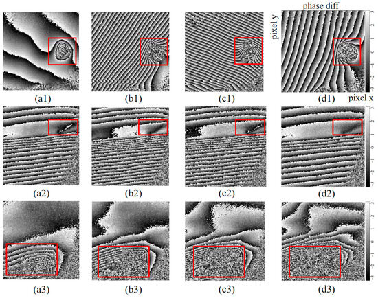 The images obtained by the sine and cosine transforms are subjected to BM3D filtering [22], and then the denoised results are subjected to the arctangent operation to obtain a phase map with a good denoising effect. While among those transform-based methods, wavelet denoising decomposes the signal into components of different scales through wavelet transforms and removes noise by setting thresholds; the window Fourier method performs local filtering in the frequency domain by setting a Gaussian window [24].