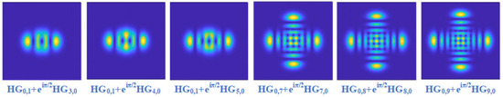 where is the ratio of the optical field intensity of the two HG modes and is the phase difference between the two modes. Thus, Figure 1 shows the simulation diagram of the superposition of two HG modes in the same direction (). And Figure 2 shows the simulation diagram of the orthogonal superposition of two HG modes with a phase difference of π/2 in different directions ().