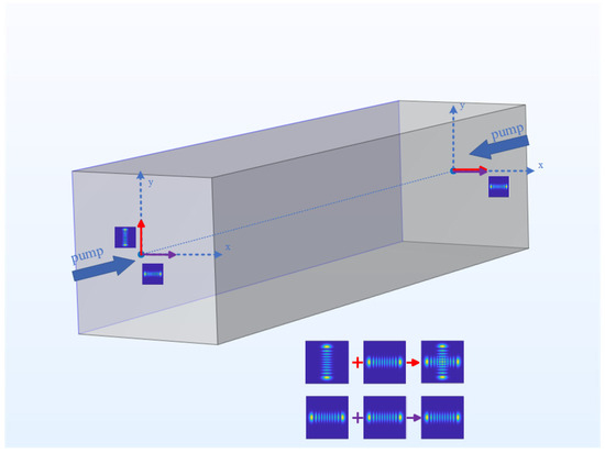 Based on the above superposition, the off-axis beam with one end off-axis in the vertical direction (y-axis) is changed to off-axis in the horizontal direction (x-axis), as shown in Figure 7 by the purple arrow. By performing double-end off-axis pumping on the crystal, HG beams in the horizontal direction are output at both ends. The off-axis distance of HG beams with a different order at the left and right ends of the crystal are measured, as shown in Figure 8b. As the horizontal off-axis distance at the crystal’s right end increases from 0 to 840 μm, continuous HG1,0–HG10,0 mode output is achieved. It can be seen from Figure 8 that when HG modes of the same order are generated at both ends of the crystal, the waist positions of the pump beams at the two ends cannot coincide completely. This positional difference will lead to changes in the gain positions of the crystal, which in turn makes the off-axis distances at the left and right ends of the crystal different. For the single side of the crystal, in the two cases of horizontal off-axis and vertical off-axis, the off-axis distance of the HG mode with the same order is not much different. This can also prove that the HG mode generated by off-axis pumping has a stable law. The double HG mode superposition state output is realized by double-end off-axis pumping. Subsequently, an astigmatic mode converter is added at the back end of the resonant cavity to realize the evolution from the double HG mode superposition state to the double LG mode superposition state. The superimposed evolution light field diagram is shown in Figure 11 and Figure 12.