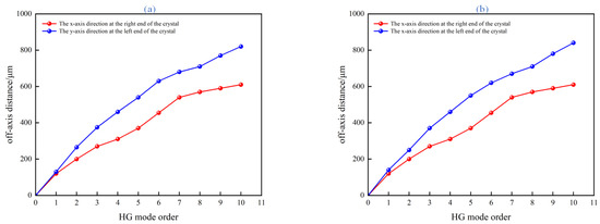 (a) The off-axis amount corresponding to the HG mode order in the case of opposite off-axis directions at both ends; (b) the off-axis amount corresponding to the HG mode order under the same off-axis direction at both ends.