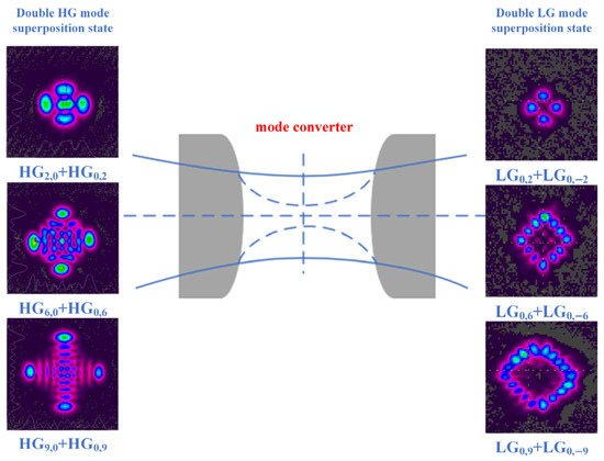 It can be observed that the double LG mode superposition state and the double diagonal HG mode superposition state can be represented by the same set of HG mode superposition states. However, adjacent modes that make up the superposition state of the double LG mode contain a factor . The factor corresponds to a π/2 phase difference. Thus, the double diagonal HG mode superposition state can be converted to the double LG mode superposition state by complementing the phase difference of π/2.