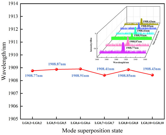 Figure 13 shows the wavelength of the double LG mode superposition state under the different mode superposition conditions. It can be observed that the output wavelength is stabilized near 1908 nm with almost no wavelength shift as the mode order changes.