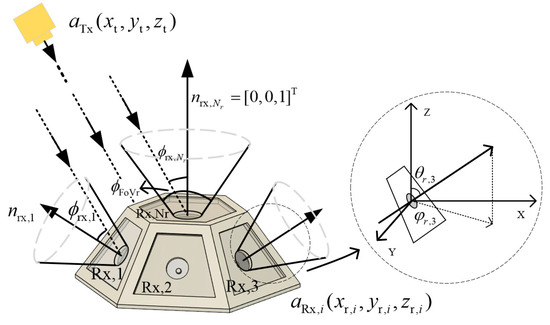 At the receiver, is the effective area of the APD, is the transmission coefficient of the optical filter, and is the angle of incidence, which is the angle between the detector’s normal and the incident ray. is the field-of-view angle of the detector, and represents the gain of the non-imaging concentrator, expressed as