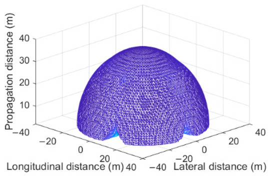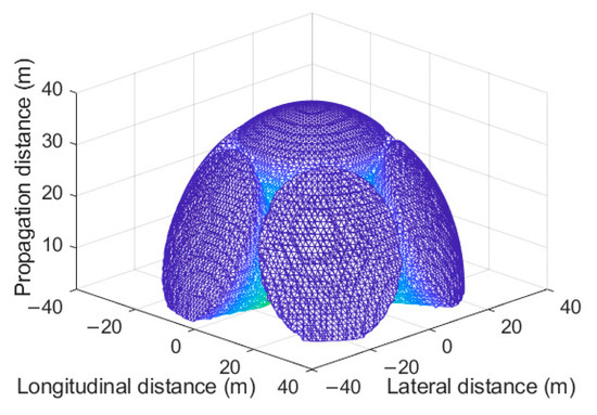 Figure 7 shows the spatial effective receiving field of view after the optimized parameter configuration. By adjusting the field-of-view and deflection angle, the blind zone distribution between adjacent OBS detector surfaces has been improved. The effective communication range is shown in Figure 8, where the blind zones within the field of view of adjacent OBS detectors at 15 m vertically and 25 m horizontally above the OBS are eliminated, reducing the communication interruptions caused by blind zones during the movement of underwater devices.