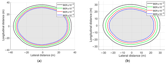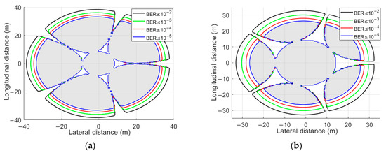 Figure 4 shows the receiving field of view of the six-faceted OBS, the optical power sensitivity threshold of the OBS receiver is set to −41 dBm, and the OBS receiver configuration is , . The three-dimensional field of view is presented through longitudinal and lateral reception. It can be seen that the multi-faceted receiver detector exhibits a conical reception mode, enabling multi-angle detection. In the communication area analysis, Figure 5 shows the effective communication area on the plane 15 m and 25 m vertically above the six-faceted OBS, demonstrating communication performance under different bit error rate thresholds from BER = 10−2 to 10−5. The effective communication area increases significantly and can meet the communication needs of mobile devices by using multi-faceted detectors. However, with the configuration of and , there is still a coverage gap blind zone between the fields of view of the detectors.