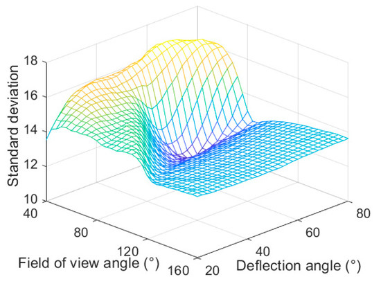 Standard deviation distribution of the uniformity of optical power distribution in the six-faceted OBS under different field-of-view and deflection angle configurations.