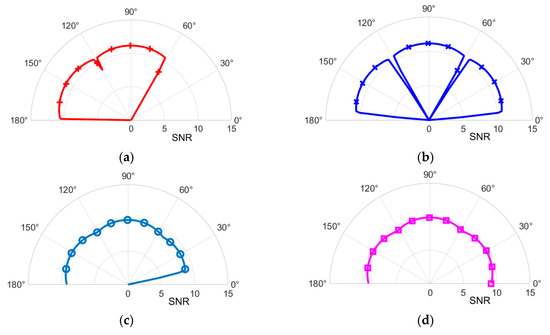 SNR distribution at different angles for two configurations. (a) Typical configuration, mobile device rotating along a semi-circular trajectory around the Y-axis; (b) Typical configuration, mobile device around the X-axis; (c) Optimized configuration, mobile device around the Y-axis; (d) Optimized configuration, mobile device around the X-axis.