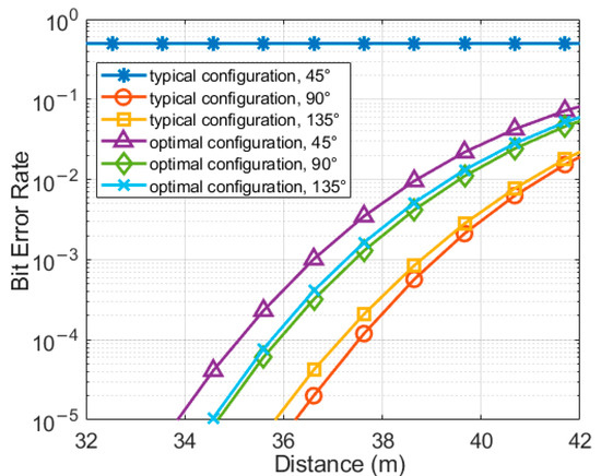 Figure 10 shows the bit error rate at different distances and angles around the Y-axis for the mobile device and OBS under both typical and optimized configurations. It can be observed that as the communication distance increases, the bit error rate gradually rises. At 90° and 135° around the Y-axis of the OBS, the transmission distance for the optimized configuration is slightly reduced by about 4% compared to the typical configuration at the same bit error rate threshold. This effect is primarily due to the gain effect introduced by the small field-of-view angle (according to Equation (8)). However, at 45° around the Y-axis of the OBS, communication is interrupted in the typical configuration due to the blind zone, while the optimized configuration maintains a link connection.