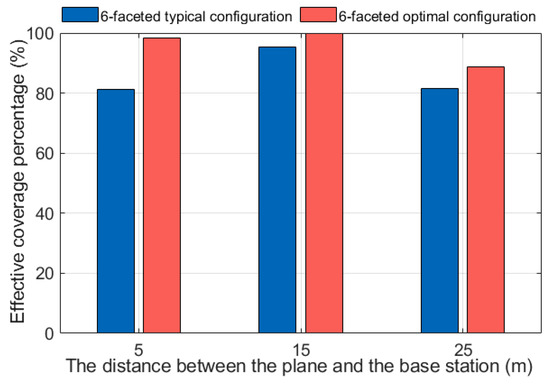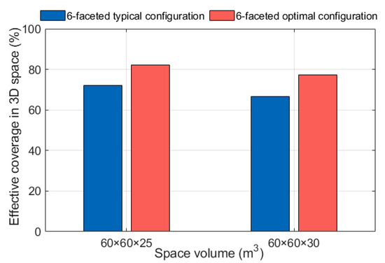 The comparison of the three-dimensional spatial field-of-view coverage parameters is shown in Figure 11. In a three-dimensional space of 60 m in length × 60 m in width × 25 m in height, the optimized configuration increased the effective field-of-view coverage from 72.05% to 82.22%, a 10.17% improvement. In a three-dimensional space of 60 m × 60 m × 30 m, the coverage increased from 66.75% to 77.34%, a 10.59% improvement. The optimized configuration significantly enhanced the spatial coverage capability of the OBS.