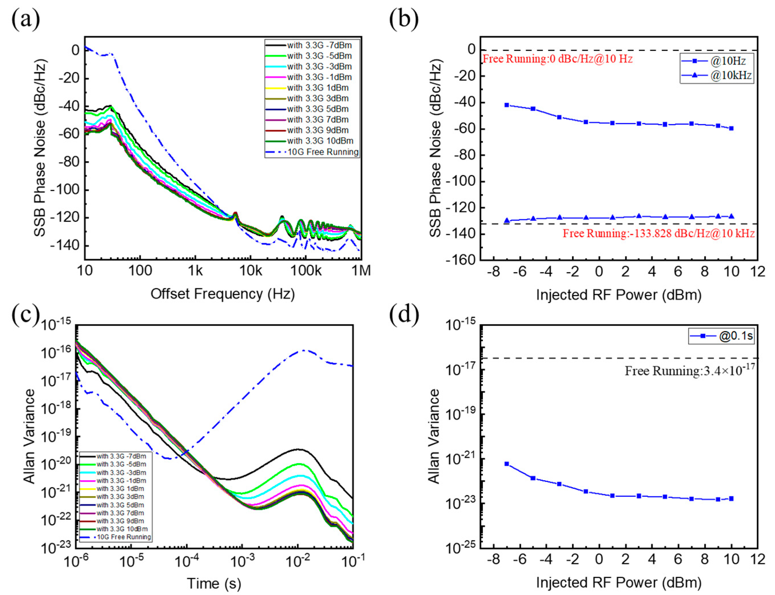 Figure 11c,d illustrate the influence of subharmonic power on the Allan variance. As the injection power increases, the Allan variance at 0.1 s improves from 5.87 × 10−22 at −7 dBm to 1.65 × 10−23 at 10 dBm, demonstrating a dependence on subharmonic injection power. However, for all injection power levels, the Allan variance can be optimized to five orders of magnitude.