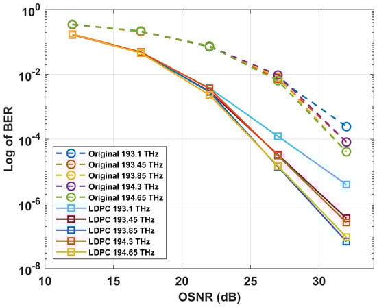 Figure 2 illustrates the significant improvement in Bit Error Rate (BER) performance with Optical Signal-to-Noise Ratio (OSNR) when LDPC coding is applied. The dashed lines represent the original system without LDPC, where BER decreases gradually as OSNR increases but remains relatively high, especially at lower OSNR values. In contrast, the solid lines indicate the LDPC-enhanced system, which exhibits a significant reduction in BER across all measured frequencies (193.1–194.65 THz).