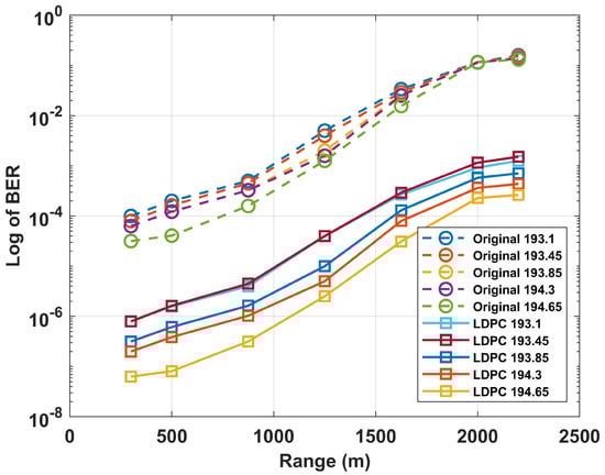 Figure 3 illustrates BER performance over varying free-space optical (FSO) link distances for both the original and LDPC-coded systems. In the absence of LDPC coding (dashed lines), the BER increases as the FSO range extends from 300 m to 2200 m, highlighting the effects of optical losses and atmospheric turbulence. At 300 m, the BER for the original system at 193.1 THz is approximately , increasing to nearly at 2200 m. A similar trend is observed across other frequencies, where, for example, at 194.65 THz, the BER degrades from approximately at 300 m to nearly at the maximum range.
