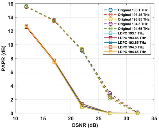 The Peak-to-Average Power Ratio (PAPR) is a key factor in OFDM-based optical networks, influencing nonlinear distortions and efficiency, especially in WDM-PON-FSO systems. Its relationship with OSNR offers insights into system resilience against noise and optical impairments. As depicted in Figure 4, the PAPR vs. OSNR trends show that increasing the OSNR leads to a reduction in PAPR across every examined channel. At lower OSNR values, such as 12 dB, heightened noise levels induce waveform distortions that amplify power fluctuations, resulting in higher PAPR. For example, at THz, PAPR reaches roughly dB when the OSNR is 12 dB, while at THz, it stands at dB. As the OSNR rises to 32 dB, these values decrease to dB and dB, respectively, signifying improved signal uniformity and fewer power peaks. LDPC coding contributes to an even lower PAPR by counteracting noise-induced waveform distortions and evening out the power distribution. Post-decoding, the PAPR shows an average reduction of 1.5–2 dB at all frequencies: at THz, for instance, PAPR drops from dB at 12 dB OSNR to dB once LDPC is applied, and at THz, PAPR descends from dB to dB under high OSNR. This improvement arises from LDPC’s capacity to rectify errors and diminish high-power spikes within the signal. Interestingly, PAPR remains largely similar across each measured frequency. This uniformity stems from the inherent statistical qualities of OFDM signals, which do not significantly depend on carrier frequency. Because each WDM channel utilizes the same OFDM configuration and power adjustments, their PAPR distributions are consistent across the band. Additionally, in a linear optical chain, identical dispersion and attenuation conditions apply to all WDM signals, thereby preserving uniform PAPR behavior. These results emphasize the critical role of PAPR reduction in high-capacity optical networks and the necessity of advanced LDPC coding in WDM-PON-FSO systems.