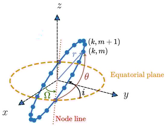 where is the initial anomaly of the first satellite at the orbit. Given these initial anomalies, we can combine (6) and (7) to obtain the values of for every time instance t and calculate the position of every satellite in the constellation using (1)–(5).