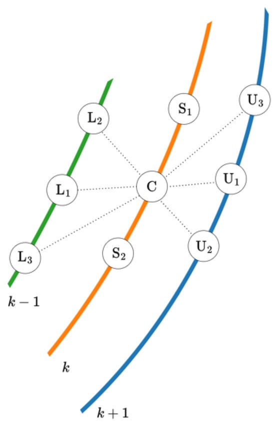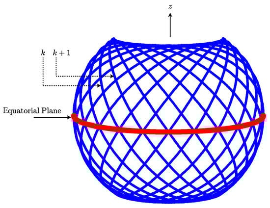 We now discuss the requirements that need to be imposed to guarantee network connectivity throughout the constellation. This typically involves conditions imposed on both intra- and inter-orbit links. Figure 4 illustrates a typical scenario where a reference satellite communicates with its adjacent satellites. The satellites and are the two nearest satellites in the same orbit k as . The satellites , , and are the first, second, and third closest satellites to , respectively, located at the next orbit, . Similarly, , , and are the first, second, and third closest satellites to , respectively, located in the previous orbit, . This group of satellites forms a swarm of nine satellites around with a constant line of sight. We assume that the connectivity of with the rest of the satellites of is the minimum requirement to achieve reliable communication with the rest of the network, providing various alternative paths for data routing. This must be met for the swarm of every satellite in the constellation, as it implies that any two satellites in the communication can communicate with each other using a single hop or multiple hops. Similar to what we discuss in Section 2.2, due to the uniformity of the constellation, it is not necessary to address the swarms formed around every satellite in the constellation. Instead, we can focus on just a single reference satellite, since the distance variation between satellites in the swarm will be the same if we change the reference satellite , albeit with a time offset.