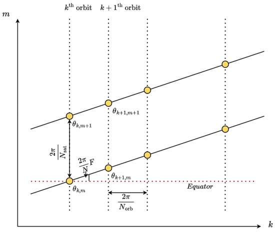 where N is the total number of satellites in the constellation . The parameter F is an integer in the range of . This scheme is illustrated in Figure 3.