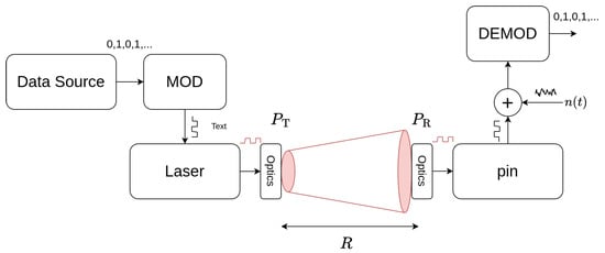 In this section, we elaborate on the link model adopted in order to calculate the physical layer performance and the required optical transmitter power to maintain connectivity. Figure 5 shows the basic block diagram of an OIL. The data source modulates the amplitude produced by a laser diode, and after the beam is shaped by the transmitter optics, it propagates in free space until it reaches the receiving end where a receiver converts the incoming light back to an electrical signal. The performance is impaired by the additive white Gaussian noise (AWGN) added to the signal. In what follows, we assume an intensity modulation/direct detection (IM/DD) with on–off keying (OOK) and note that the model could be extended to also account for multi-level schemes [], polarization [] or wavelength division multiplexing [], and coherent detection [].