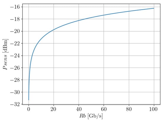 In Figure 6, we illustrate the values obtained for , assuming the parameters in Table 2. As expected, the sensitivity value increases with the data rate reaching just below ≅ at .